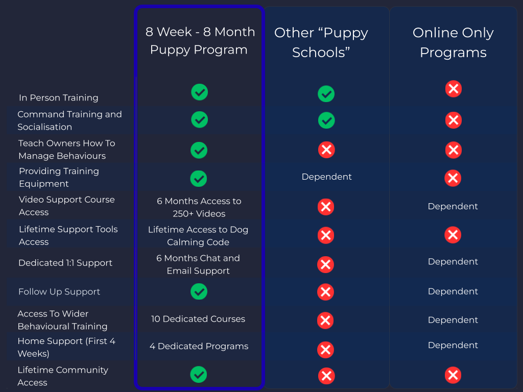 This was based on feedback from our clients in both our puppy school and adult dog behavioural programs. We would work with plenty of clients who had received a "gold star" during puppy school but 4 months later couldn't walk their dog without barking. That isn't right. Helping your puppy to develop is far more than puppy school. Is it important for helping with commands and socialisation, absolutely but it is just a piece of the puzzle.
